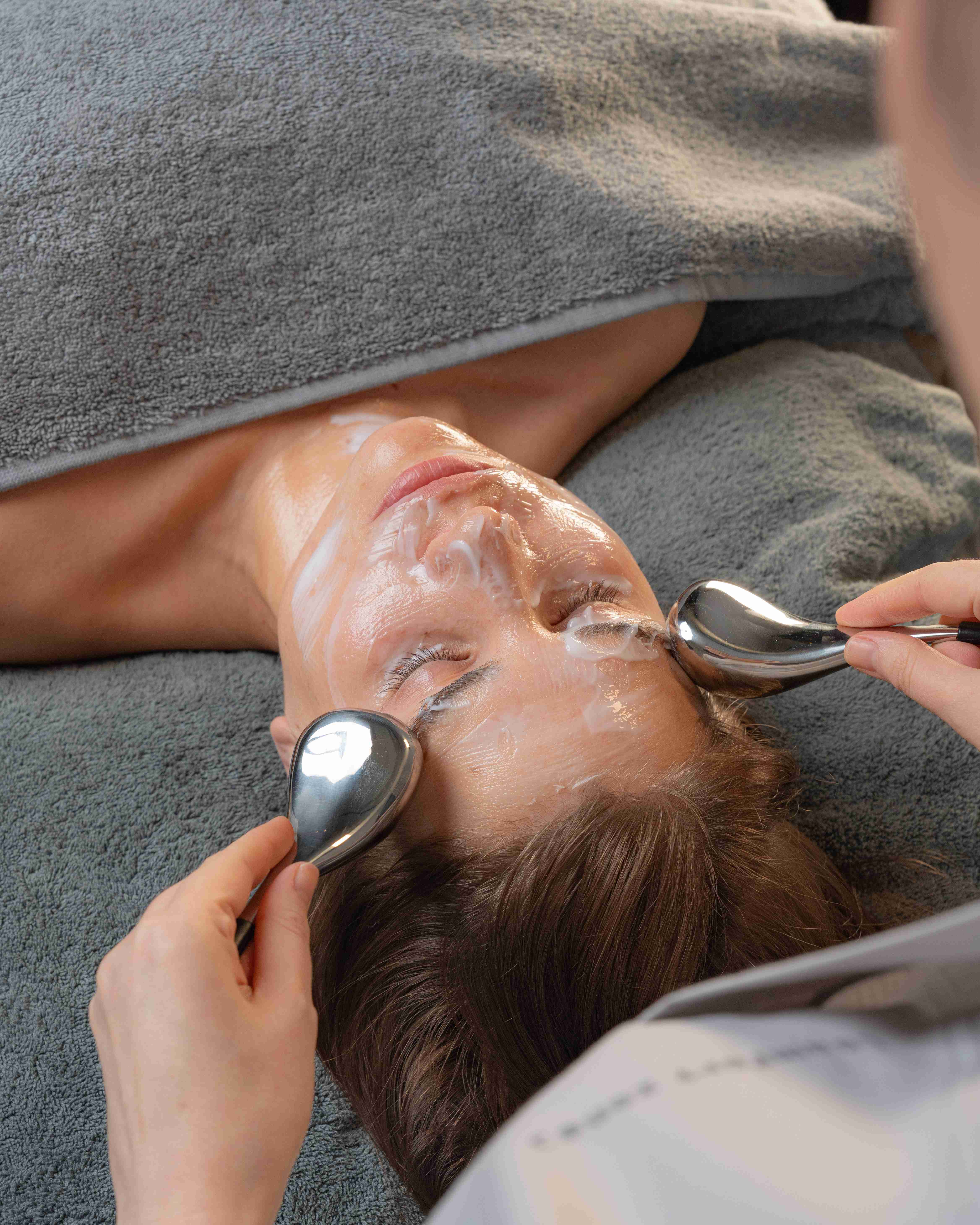 Behandlingen inkluderar rengöring, AHA-peeling, ansiktsmask samt både lyftande och dränerande Ice Spoons-massage – för en klarare, jämnare hud med vacker lyster.